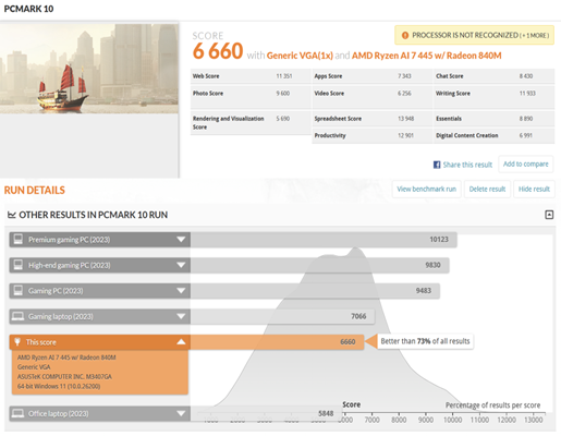 Trong bài đo PCMark 10, cấu hình Ryzen AI 7 445 kết hợp RAM 16GB và SSD NVMe Gen 4 đạt điểm số cao hơn khoảng 73% các hệ thống được ghi nhận, cho thấy hiệu năng thực tế vượt xa mức “đủ dùng” cho công việc hàng ngày. Điểm số làm việc của Ryzen AI 7 445 đạt khoảng 6.660 điểm, tiệm cận nhiều mẫu laptop hiệu năng cao, trong khi mức tiêu thụ điện năng thấp hơn đáng kể.