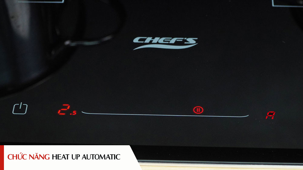 Chức năng nấu thông minh Heat up automatic: Bếp nấu nướng tự động theo chương trình cài đặt sẵn. Đây là một tính năng ninh hầm tự động được tích hợp mẫu bếp từ Chefs EH DIH888, giúp bếp tự động nâng công suất đun nấu lên mức cao nhất trong khoảng thời gian 3 đến 5 phút, sau đó bếp tự động chuyển về ninh hầm ở mức công suất thấp hơn mà bạn đã chọn trước đó