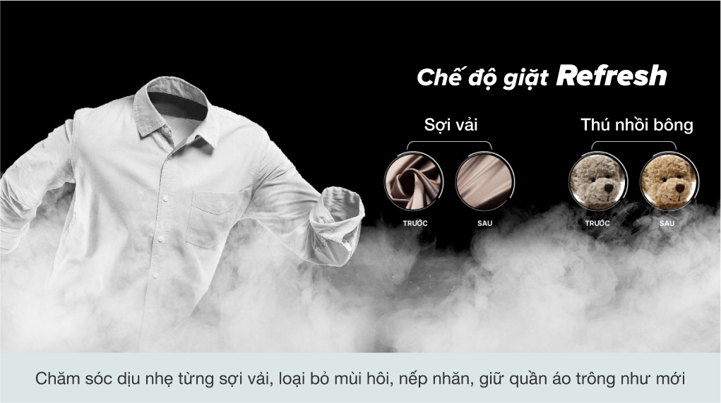 - Giặt hơi nước: hơi nước và bột giặt được khuếch tán bên trong lồng giặt ở nhiệt độ 60°C đến 90°C giúp thẩm thấu vào quần áo tốt hơn, nhanh chóng loại bỏ các vết bẩn cứng đầu, đồng thời giúp loại bỏ vi khuẩn và các chất gây dị ứng, an toàn cho da nhạy cảm.