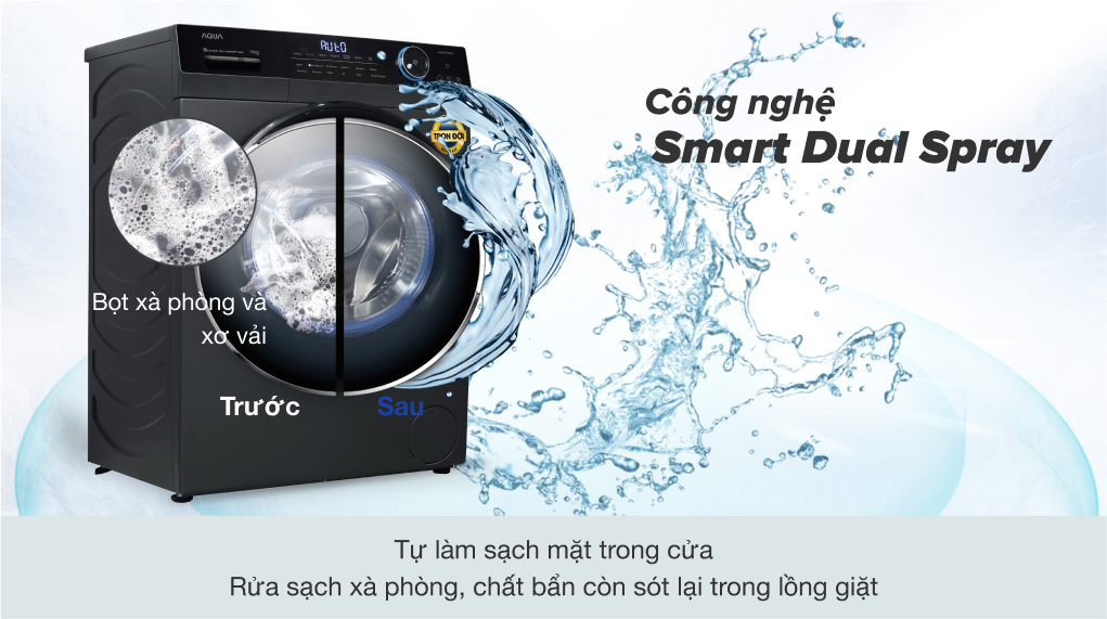 - Công nghệ Smart Dual Spray tự làm sạch mặt trong cửa hạn chế xơ vải bám vào quần áo ở lần giặt sau nhờ các tia nước tự động rửa sạch xơ vải còn sót lại ở khu vực mặt trong cửa/vòng đệm sau mỗi lần giặt.