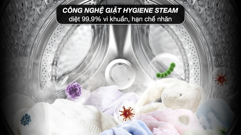 - Tính năng Hygiene Steam sử dụng hơi nước ở cuối chu trình để diệt đến 99.9% vi khuẩn, giảm dị ứng và làm mềm vải tự nhiên.