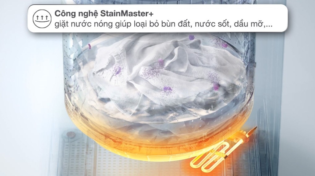 - Công nghệ StainMaster+ giặt nước nóng xử lý hiệu quả các vết bẩn cứng đầu như dầu mỡ, bùn đất, cổ áo… nhờ nhiệt độ nước kiểm soát chính xác, giúp tăng khả năng giặt sạch mà vẫn dịu nhẹ với sợi vải.