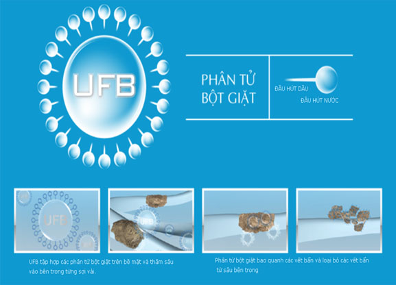 Máy giặt Toshiba với công nghệ siêu bọt khí Nano (UFB) tạo ra các bọt khí có kích thước Nano siêu nhỏ, nhỏ hơn 200 lần so với khe hở giữa các sợi vải, dễ dàng thấm sâu, loại bỏ các chất bẩn một cách hiệu quả.