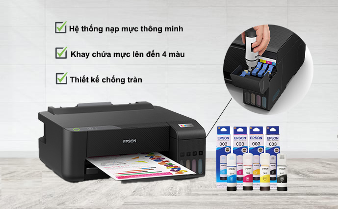 Máy in Espon thiết kế giúp bơm mực với thao tác cực kỳ đơn giản, bằng cách châm mực vào hệ thống mực liên tục với mực chính hãng Epson. Mức tiêu thụ điện năng thấp hơn 70% so với các máy in laser truyền thống.