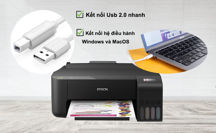 Máy in phun Epson L1210 đơn năng kết nối bằng cổng USB 2.0 tốc độ cao giúp máy nhận và thực hiện lệnh in một cách nhanh chóng, kết nối được cả hai hệ điều hành Windows và MacOS mang lại hiệu quả làm việc tốt nhất.