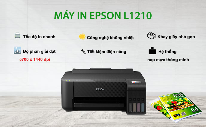 Máy in phun màu đơn năng Epson L1210 với độ phân giải 5760 x 1440 dpi và kích thước giọt mực 3pl, mang lại cho bạn những bản in màu chất lượng và cực kỳ sắc nét, không bị lem màu. Tốc độ in của Epson L1210 cũng khiến bạn phải ngạc nhiên: Tốc độ in 33 trang / phút (đen), 15 trang/phút (màu)
