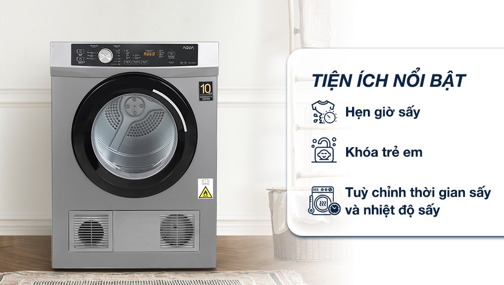 Máy sấy thông hơi Aqua 8 kg AQH-V800H.SS sở hữu gam màu xám sang trọng, thiết kế nhỏ gọn. Trang bị động cơ BLDC vận hành bền bỉ, tiết kiệm điện năng, cơ chế sấy chống nhăn giúp tiết kiệm thời gian giặt ủi. Tích hợp sẵn 9 chương trình sấy tiện lợi, sấy được tối đa 8 kg quần áo, là sự lựa chọn phù hợp cho gia đình từ 3 – 5 thành viên với nhu cầu làm khô quần áo nhanh chóng, tiết kiệm thời gian cho việc phơi đồ.