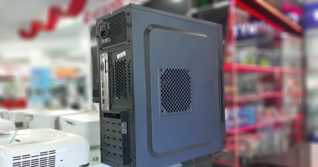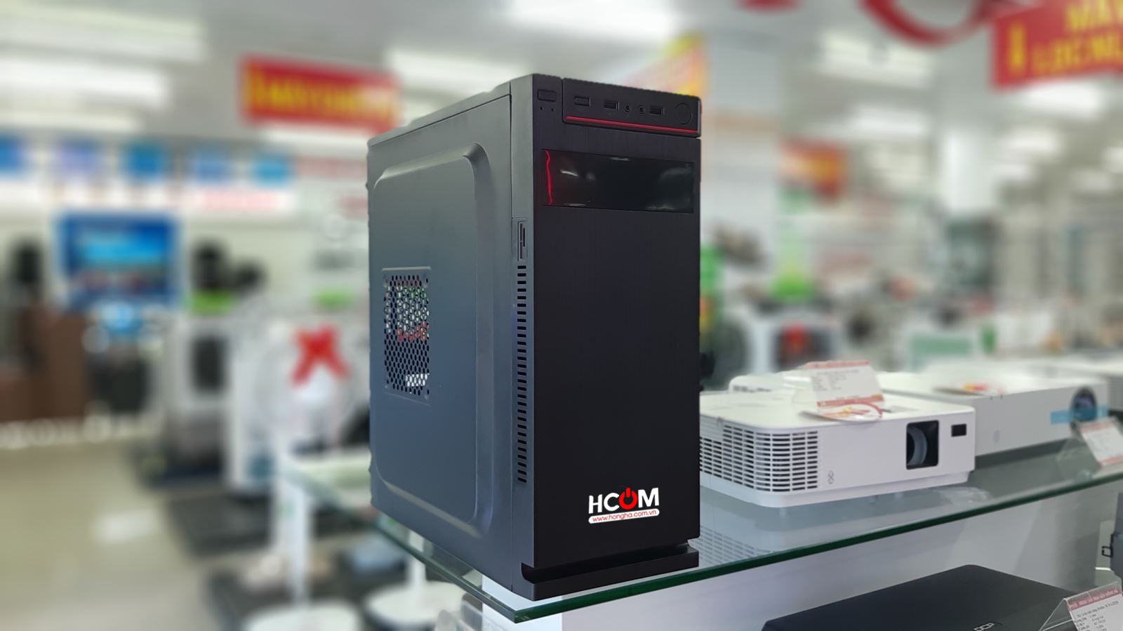 Phần khe hở có diện tích khá rộng ở bên hông nhằm tăng khả năng thoát nhiệt của máy. Máy tính để bàn HCOM có kiểu dáng nhỏ gọn phù hợp cho nhiều không gian văn phòng.