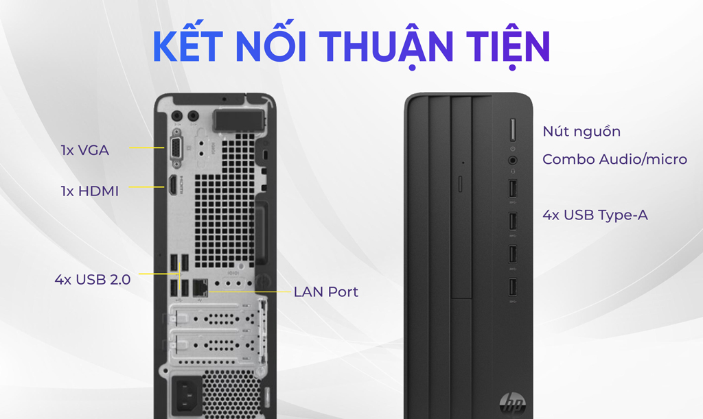 PC HP 280 Pro G9 SFF_9H1S8PT tich hợp các cổng kết nối tiêu chuẩn thường thấy ở các bộ máy đồng bộ hãng: VGA, HDMI, RJ-45, USB,....Người dùng có thể kết nối với các thiết bị ngoại vị khác.