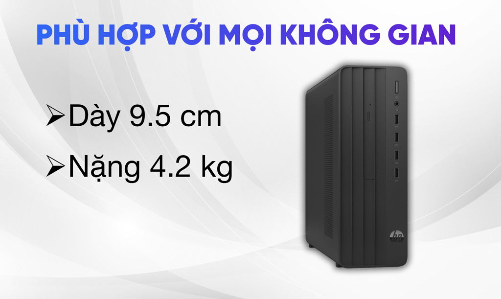 Với độ dày chưa tới 10cm, PC HP 280 Pro G9 SFF_9H1S8PT phù hợp với phần lớn không gian sử dụng. Kích thước nhỏ nhắn không chiếm nhiều diện tích, dễ xê dịch phù hợp với nhóm khách hàng hay di chuyển địa điểm làm việc.