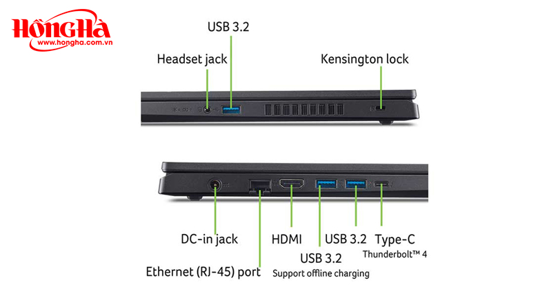 Laptop Acer Gaming Nitro V 15 ProPanel ANV15-52-72BM_NH.QZ9SV.004 được trang bị đầy đủ các cổng kết nối thông dụng như LAN (RJ45), Jack tai nghe 3.5 mm, 3 x USB 3.2, HDMI 2.1 và USB Type-C (hỗ trợ USB, DisplayPort, Thunderbolt 4), giúp bạn dễ dàng kết nối với các thiết bị ngoại vi. Kết nối không dây Wi-Fi 802.11 a/b/g/n/ac và Bluetooth 5.4 cho tốc độ truyền tải dữ liệu nhanh chóng và ổn định. Viên pin 4-cell, 76 Wh cung cấp thời lượng sử dụng đủ cho một ngày làm việc hoặc giải trí.