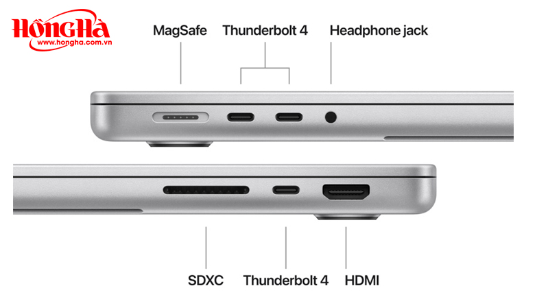 Laptop cho có thể tương thích tốt với cả hai màn hình ngoài, mở rộng không gian làm việc và giải trí của bạn. Đồng thời có đầy đủ các cổng như jack tai nghe, HDMI và Thunderbolt 4 với tốc độ truyền dữ liệu lên đến 40 Gb/s. Hệ thống sạc MagSafe 3 không chỉ đảm bảo sạc nhanh chóng mà còn sở hữu thiết kế tinh tế với cơ chế hút nam châm hiện đại. Máy cũng hỗ trợ chuẩn kết nối không dây Wi-Fi 6E và Bluetooth 5.3.