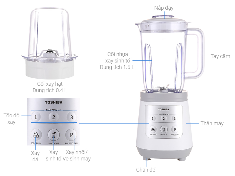 Công suất mạnh mẽ Công suất 700 W, tổng lưỡi dao 2 cối là 3 lưỡi, 6 cánh sắc bén bằng thép không gỉ bền bỉ, xay nhuyễn mọi nguyên liệu trong thời gian ngắn Cối máy xay sinh tố đa năng làm bằng nhựa cao cấp, an toàn cho sức khỏe, kháng vỡ, dễ làm sạch, cối lớn dung tích đến 1.5 lít, xay được lượng lớn thực phẩm cùng lúc Máy xay sinh tố có cối xay hạt nhỏ dung tích 0.4 lít, thích hợp xay các loại hạt, đậu, tiêu, ớt, tỏi... |