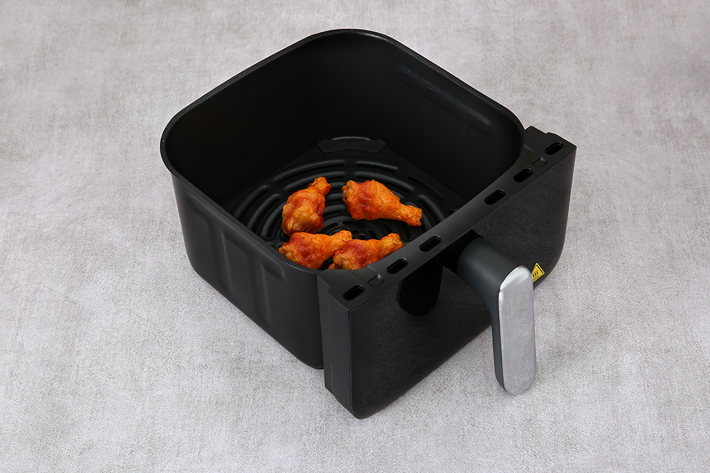 - Nồi chiên không dầu với dung tích sử dụng 7 lít có thể chiên được gà nguyên con khoảng 1.5 kg hoặc 6 chiếc đùi gà cùng một lúc.