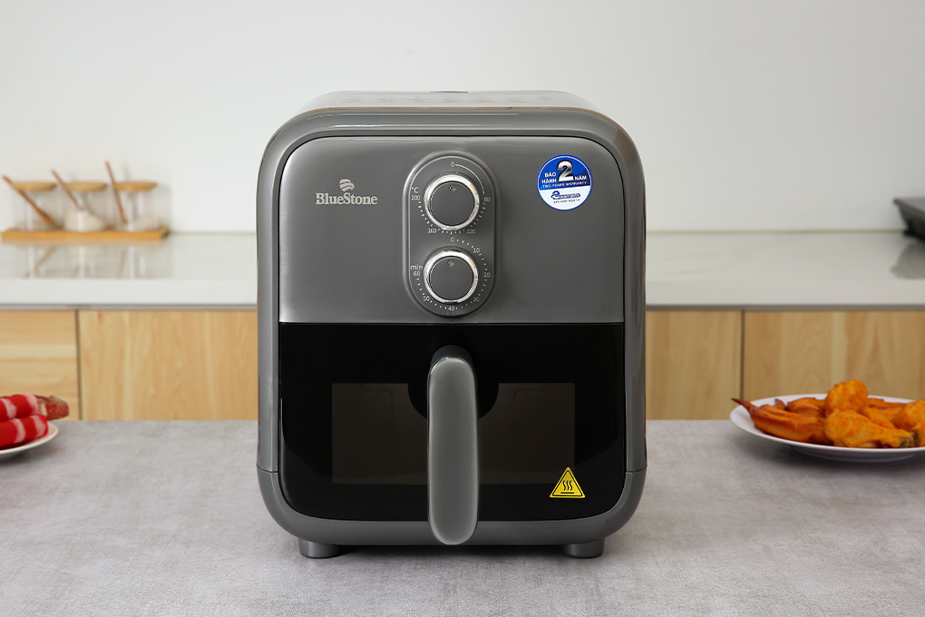 - Nồi chiên không dầu BlueStone điều khiển bằng nút xoay đơn giản. Mặt trên của sản phẩm còn được trang bị bảng công thức tham khảo với hình ảnh minh họa sinh động, hỗ trợ người dùng dễ dàng lựa chọn chế độ chiên, nướng phù hợp.