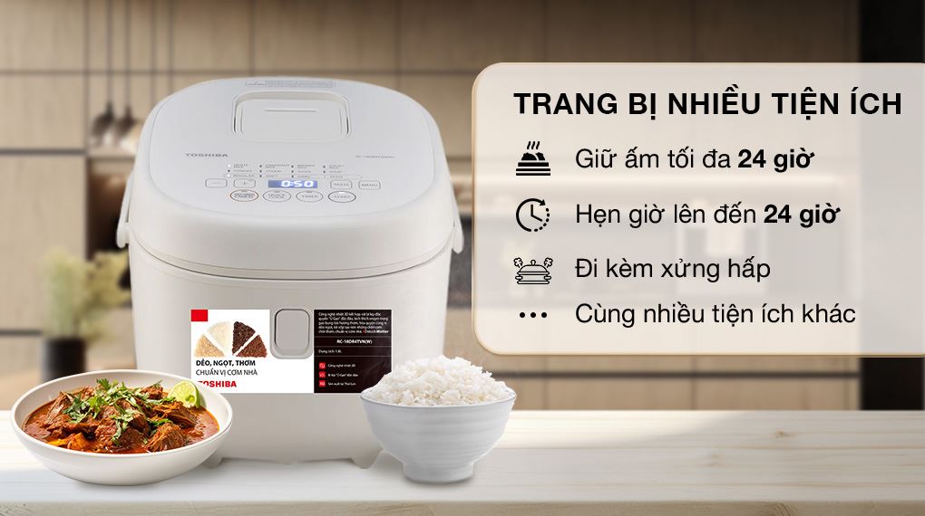 Với thiết kế hiện đại nhưng không kém phần sang trọng, tích hợp 10 chương trình cài đặt sẵn tiện lợi, chức năng hẹn giờ và giữ ấm lên đến 24 giờ cho phép người dùng tự chủ và tiết kiệm thời gian, Nồi cơm điện tử Toshiba RC-18DR4TVN(W) sẽ là một trợ thủ đắc lực giúp bạn thảnh thơi hơn trong việc bếp núc.