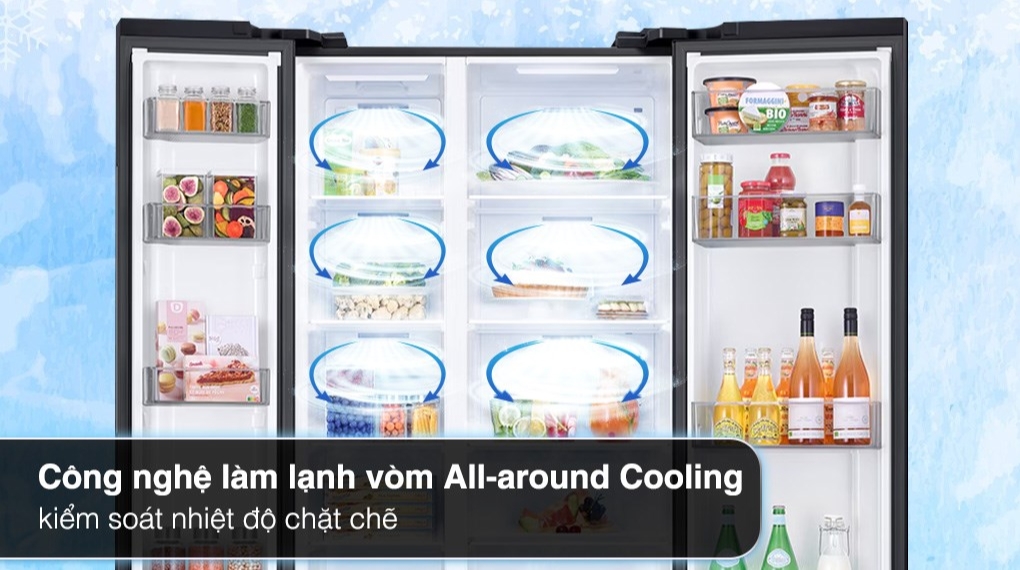 - Với công nghệ làm lạnh vòm All-around Cooling thực phẩm sẽ được bảo quản và làm lạnh toàn diện nhờ các hơi lạnh lan tỏa đều theo hình vòng cung, giúp kiểm soát chặt chẽ sự thay đổi nhiệt độ và luân chuyển hơi lạnh bao phủ toàn bộ thực phẩm thông qua hệ thống lỗ khí bố trí thông minh.