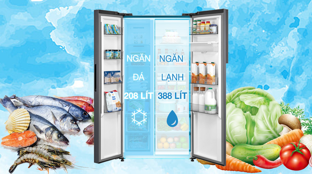 - Ngăn lạnh có dung tích 388 lít, gồm có 3 kệ chia làm 4 ngăn và 2 hộc đựng rau củ quả. Phía bên cánh cửa tủ ngăn lạnh được thiết kế 3 khay chứa và 1 hộp đựng nước.